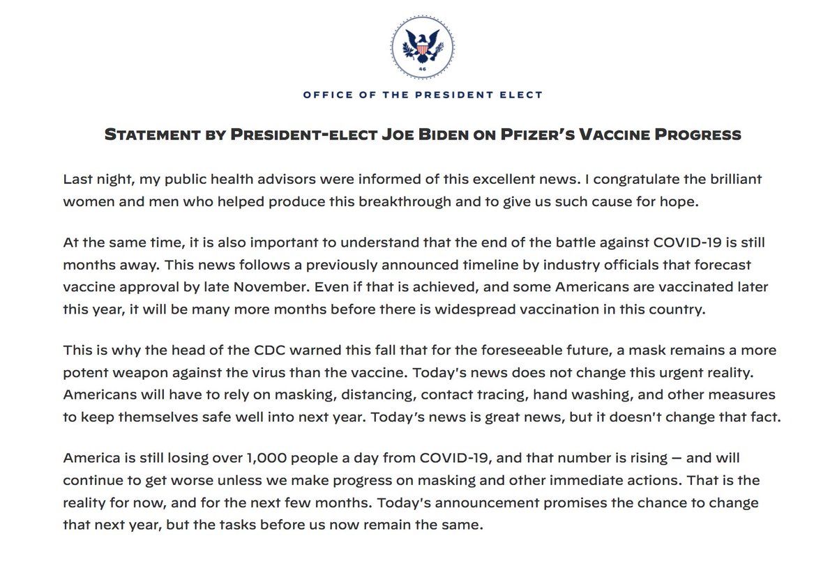 : Statement by President-elect Biden on Pfizer's vaccine progress: