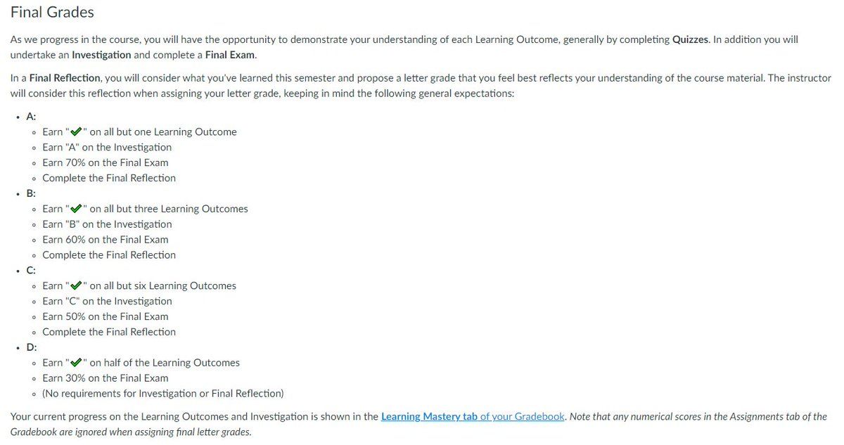 My current draft taking a stab at #ungrading this fall. I like having strongly suggested specifications for each letter grade so students have a clear understanding of my general expectations, but leaving the door open to other arguments.